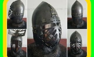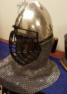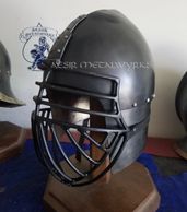 A Riveted Bascinet is a great option for the person looking to build up a 14th century kit. This will allow you to move in stages if necessary. The removable mild steel bar grill (or if you choose the stainless cut face plate) allows for a Klapp visor to be purchased at a later date and added without modifying the existing helmet.