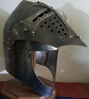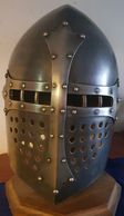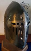 The heavy 12 gauge stainless steel includes slots in the eyes to meet several of the fighting league rules. If you don't need them, just be sure to include that in the order instructions. These helms are built with steel rivets unless you order the cross, then brass rivets are used on the cross.